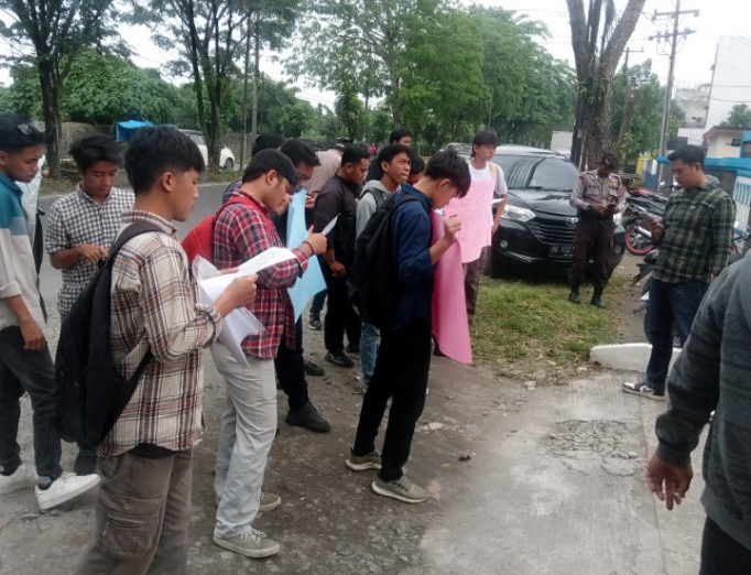 Sekira pukul 11.00 WIB mahasiswa membawa pengeras suara dan beberapa poster yang bertuliskan “Hakim PTUN harus adil, jangan ada kongkalikong di PTUN !!”.