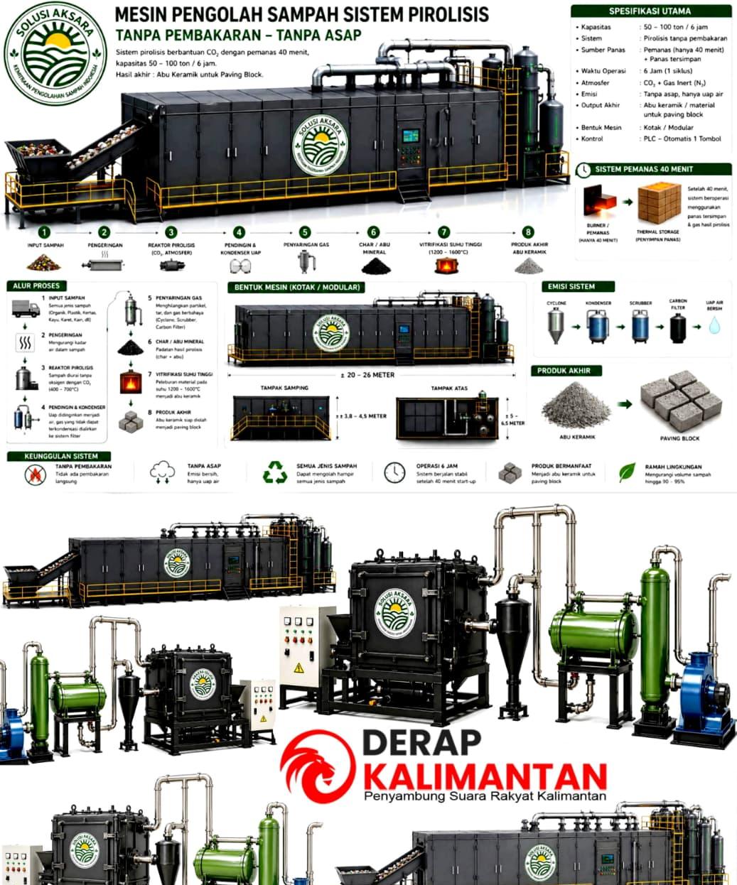 Mesin berdesain modular 20–26 meter dengan kontrol PLC 1 tombol ini mampu mengolah sampah campuran: organik, plastik, styrofoam, sachet, kayu, hingga karet yang selama ini jadi residu TPA.