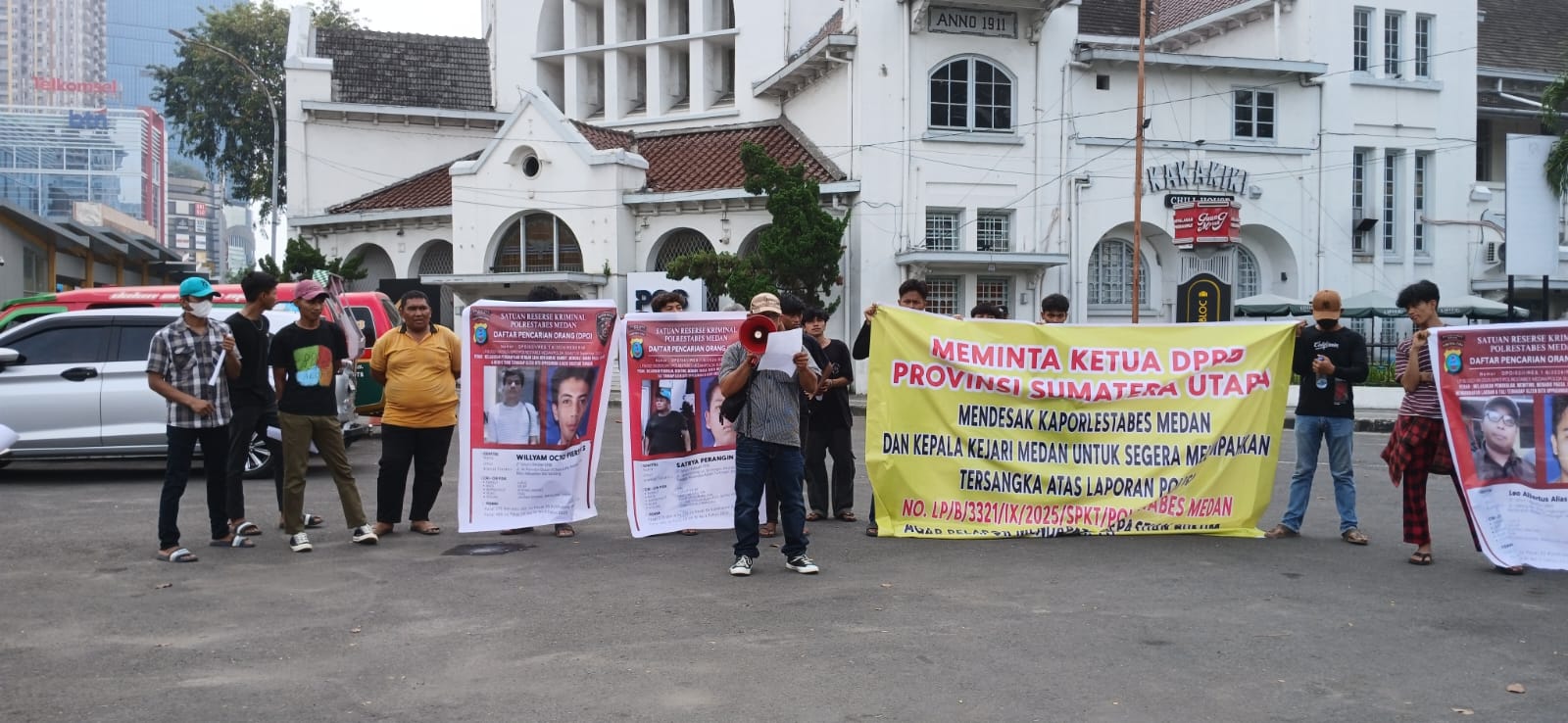 Aksi tersebut digelar sebagai bentuk protes atas belum tertangkapnya tiga tersangka berstatus Daftar Pencarian Orang (DPO), yakni Leo Albertus alias Leo Sembiring, Satrya Peranginangin, dan William, yang telah ditetapkan sejak awal Februari 2026 oleh Polrestabes Medan.