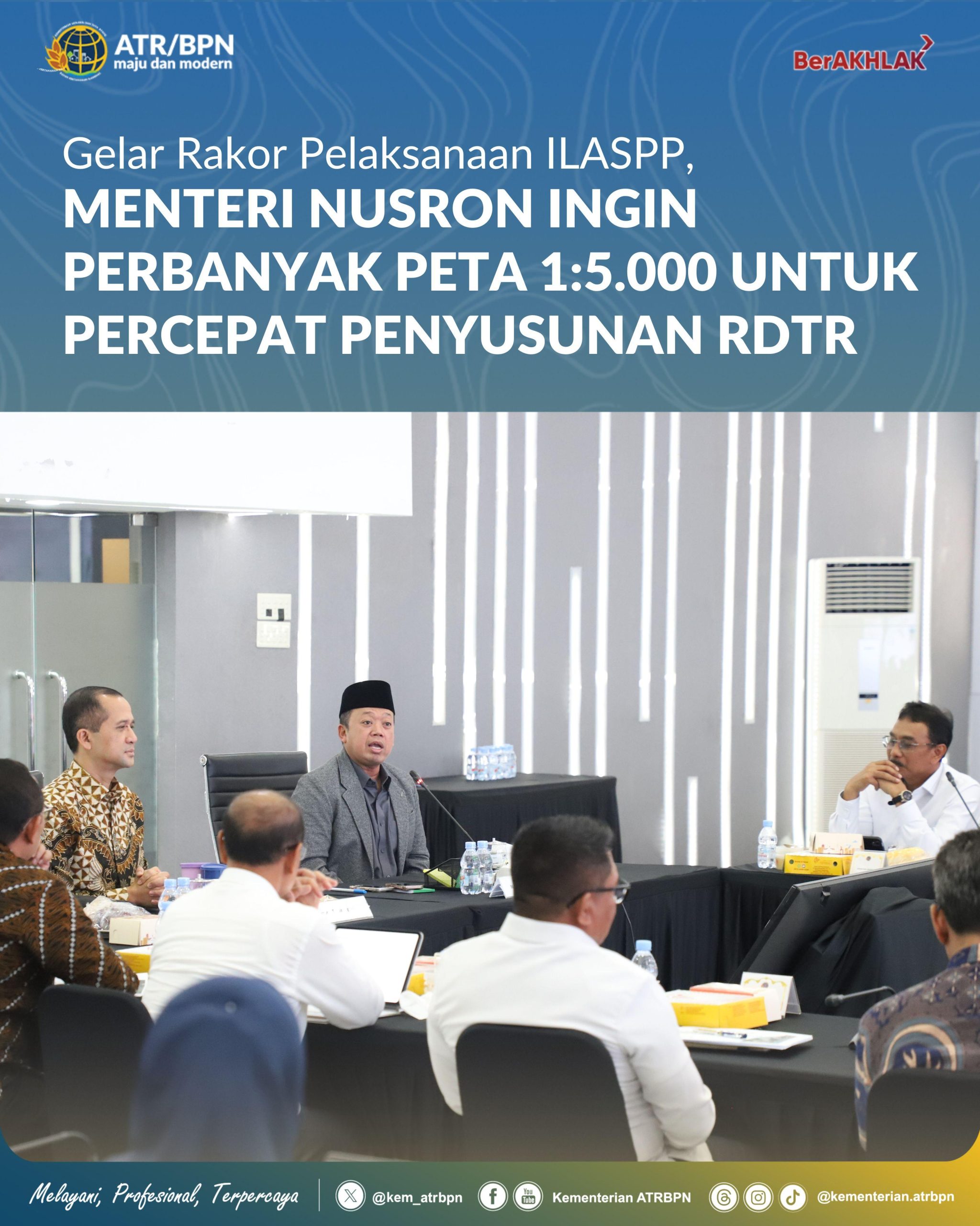 Jakarta – Kementerian Agraria dan Tata Ruang/Badan Pertanahan Nasional (ATR/BPN) menggelar Rapat Koordinasi Pelaksanaan Integrated Land Administration and Spatial Planning Project (ILASPP), Kamis (29/01/2026), di Aula Prona Kementerian ATR/BPN. Rapat koordinasi yang dipimpin Menteri ATR/Kepala BPN, Nusron Wahid, ini difokuskan pada evaluasi capaian program ILASPP selama tahun 2025 serta percepatan penyusunan peta skala 1:5.000 sebagai dasar penyusunan Rencana Detail Tata Ruang (RDTR) di daerah.