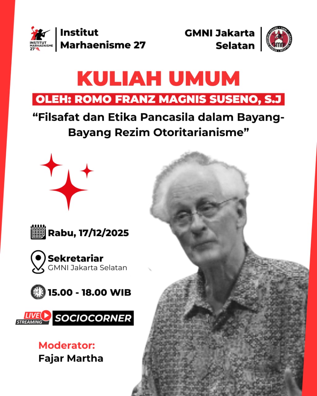 Jakarta,- Gerakan Mahasiswa Nasional Indonesia (GMNI) Jakarta Selatan akan menyelenggarakan kuliah umum dengan tema “Filsafat dan Etika Pancasila dalam Bayang-Bayang Rezim Otoriterianisme” pada Rabu, 17 Desember 2025, pukul 15.00 – 18.00 WIB di Sekretariat GMNI Jaksel, Jln. Pancoran Buntu II.