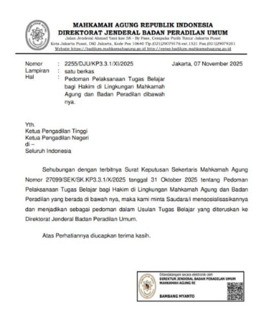 Jakarta -Jumat, 14 Nov 2025, – Untuk memenuhi kebutuhan tenaga yang memiliki keahlian atau kompetensi tertentu dalam pelaksanaan tugas pokok fungsinya, Sekretaris Mahkamah Agung RI pada Jumat (31/10/2025) telah menerbitkan aturan terbaru terkait pedoman pelaksanaan tugas belajar bagi hakim di lingkungan Mahkamah Agung dan Badan Peradilan di Bawahnya.