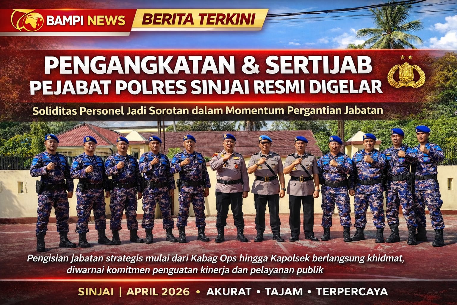 Sinjai – Kepala Kepolisian Resor Sinjai Ajun Komisaris Besar Polisi (AKBP) Jamal Fathur Rakhman, S.Ik.,MH pimpin upacara pengangkatan jabatan Kabag Ops, Kabag Log, Kasat Lantas dan sertijab Kabag Ren, Kasat Polairud, Kapolsek Sinjai Borong, Kasi Propam dan Kapolsek Pulau Sembilan. Selasa (14/4/2026).