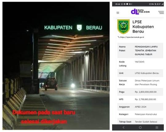 Berau, DerapKalimantan.com, Senin, 29/12/2025, Proyek pemasangan lampu tematik di Jembatan Gunung Tabur, Kabupaten Berau, yang menelan anggaran sekitar Rp2,8 miliar dari APBD Berau Tahun 2024, kini menjadi sorotan tajam publik.