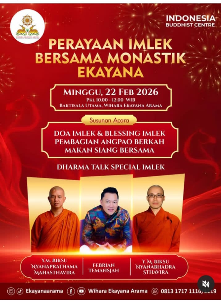 Derapkalimantan.com – Jakarta Barat, DKI Jakarta – Wihara Ekayana Arama, Minggu, 22 Februari 2026 – Lebih dari 2000 umat menghadiri acara Imlek Bersama di Wihara Ekayana Arama pada hari Minggu, 22 Februari 2026. Acara ini diawali dengan pembacaan paritta singkat, diikuti dengan Talkshow Dharma Special Imlek yang menampilkan Y. M. Biksu Nyanaprathama Mahasthawira, Y. M. Biksu Nyanabhadra Sthawira, dan Bapak Febrian Temansjah.