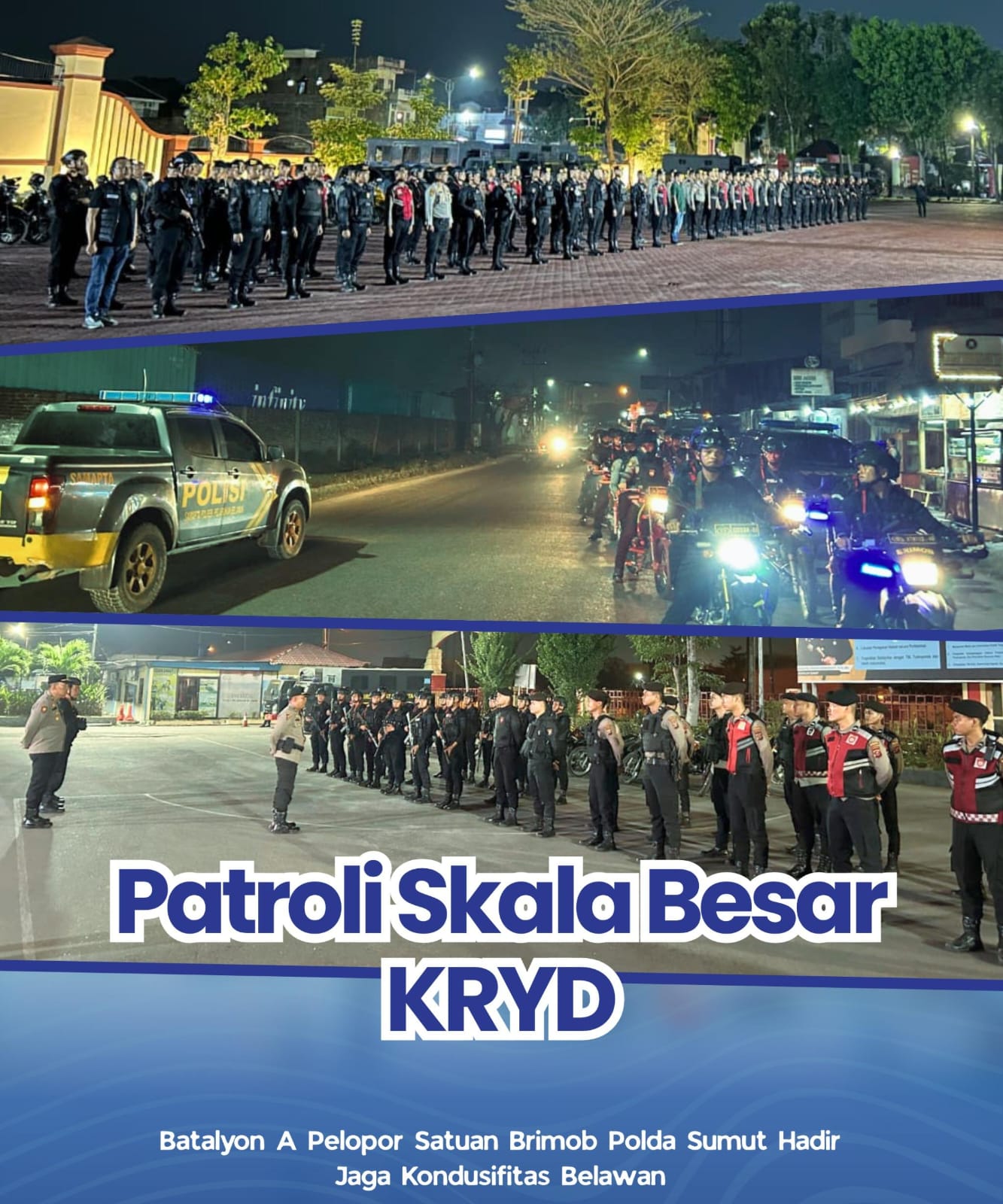Medan — Komitmen menjaga keamanan terus ditunjukkan oleh Batalyon A Pelopor Satuan Brimob Polda Sumatera Utara melalui pelaksanaan Kegiatan Rutin Yang Ditingkatkan (KRYD) dengan patroli skala besar di wilayah hukum Polres Pelabuhan Belawan, Jumat malam hingga Sabtu dini hari (24–25 April 2026).