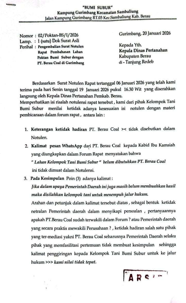 Atas dasar itu, Poktan Bumi Subur secara resmi mengembalikan notulen rapat tersebut kepada Dinas Pertanahan Kabupaten Berau. Pengembalian dilakukan karena beberapa alasan prinsipil, di antaranya isi notulen yang dinilai tidak lengkap dan tidak memuat seluruh poin yang berkembang dalam rapat, tidak adanya gambaran rencana pemerintah daerah untuk melakukan peninjauan langsung ke objek lahan yang disengketakan, serta tidak terlihat adanya upaya konkret pemerintah daerah untuk kembali mempertemukan kelompok tani dengan PT Berau Coal.