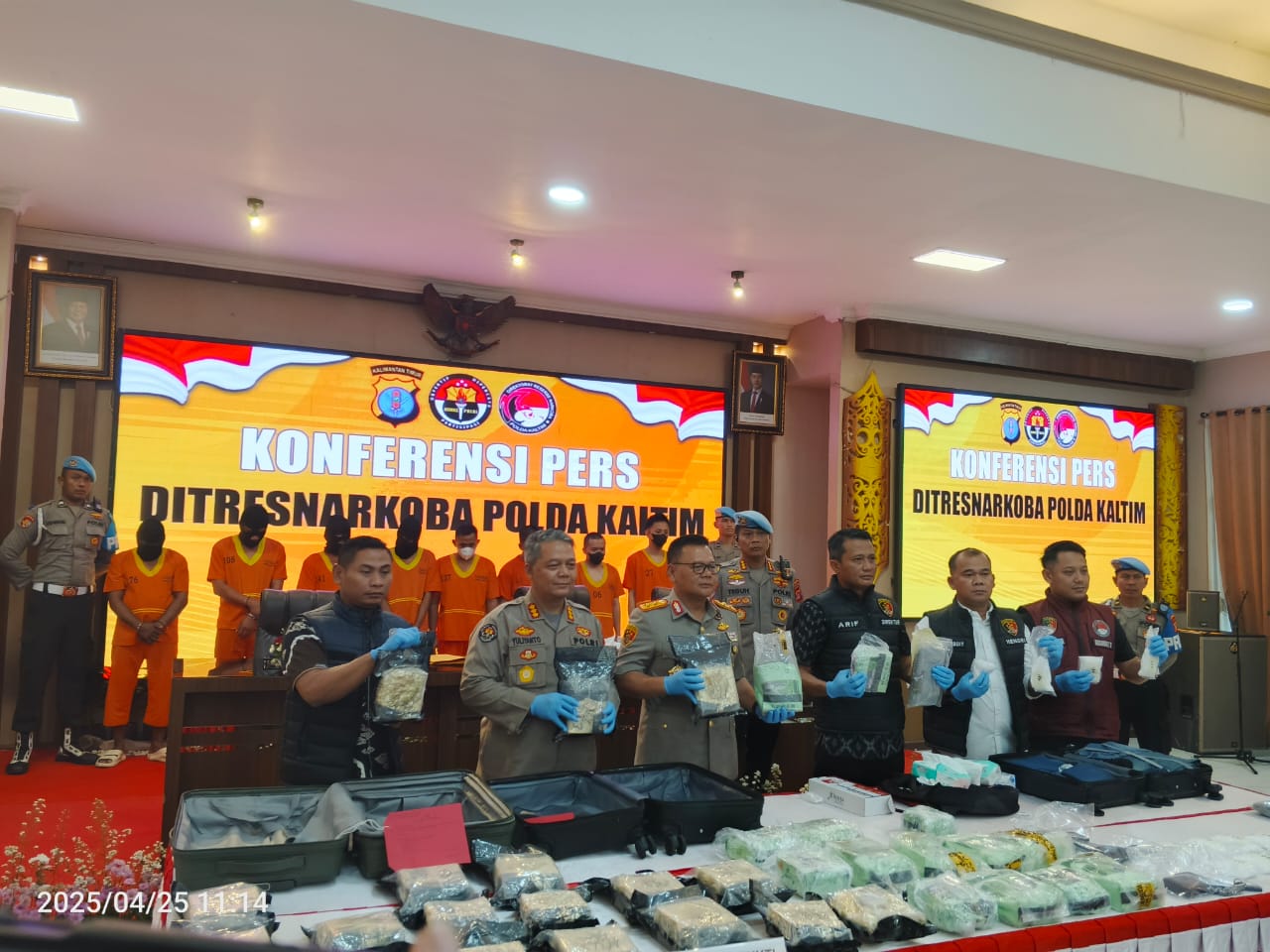 BALIKPAPAN – Melalui Konferensi Pers Kepala Kepolisian Daerah Kalimantan Timur (Kaltim) kembali menyampaikan pemberantasan peredaran narkotika. Digelar di Gedung Mahakam Mapolda Kaltim. Jumat (25/04/2025).