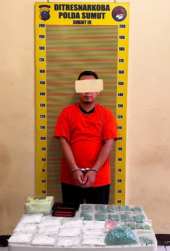 Medan – Direktorat Reserse Narkoba Polda Sumatera Utara kembali mengungkap kasus peredaran narkotika dalam jumlah besar. Seorang pria berinisial AS (39), yang diketahui berprofesi sebagai guru swasta, diamankan petugas bersama barang bukti sabu seberat lebih dari dua kilogram serta ribuan butir pil diduga ekstasi.