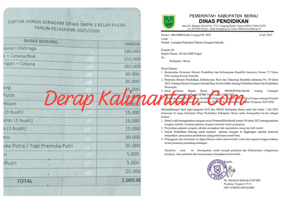 Larangan penjualan seragam juga telah ditegaskan dalam surat resmi Dinas Pendidikan Kabupaten Berau Nomor: 800/2169/Disdik-Umpeg/VII/2025, tanggal 8 Juli 2025, yang antara lain menyatakan: