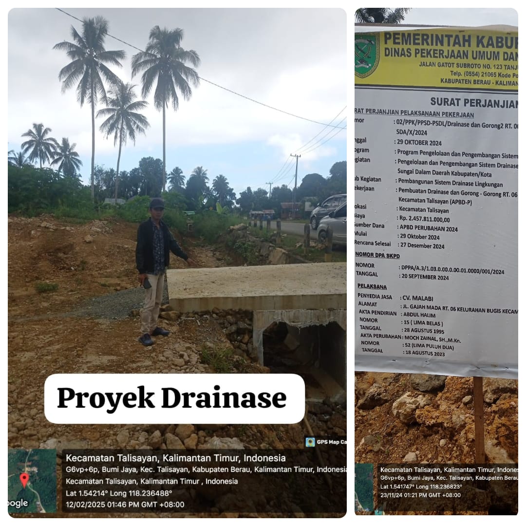 Derap Kalimantan. Com | Berau, Talisayan | Rabu, 12/3/2025 | Proyek pembangunan drainase di Kampung Dumaring, RT 06, Kecamatan Talisayan, Kabupaten Berau, kembali menjadi sorotan. Proyek yang menelan anggaran hingga Rp2.457.811.000,00 itu diduga mangkrak dan pengerjaannya dinilai tidak sesuai standar.