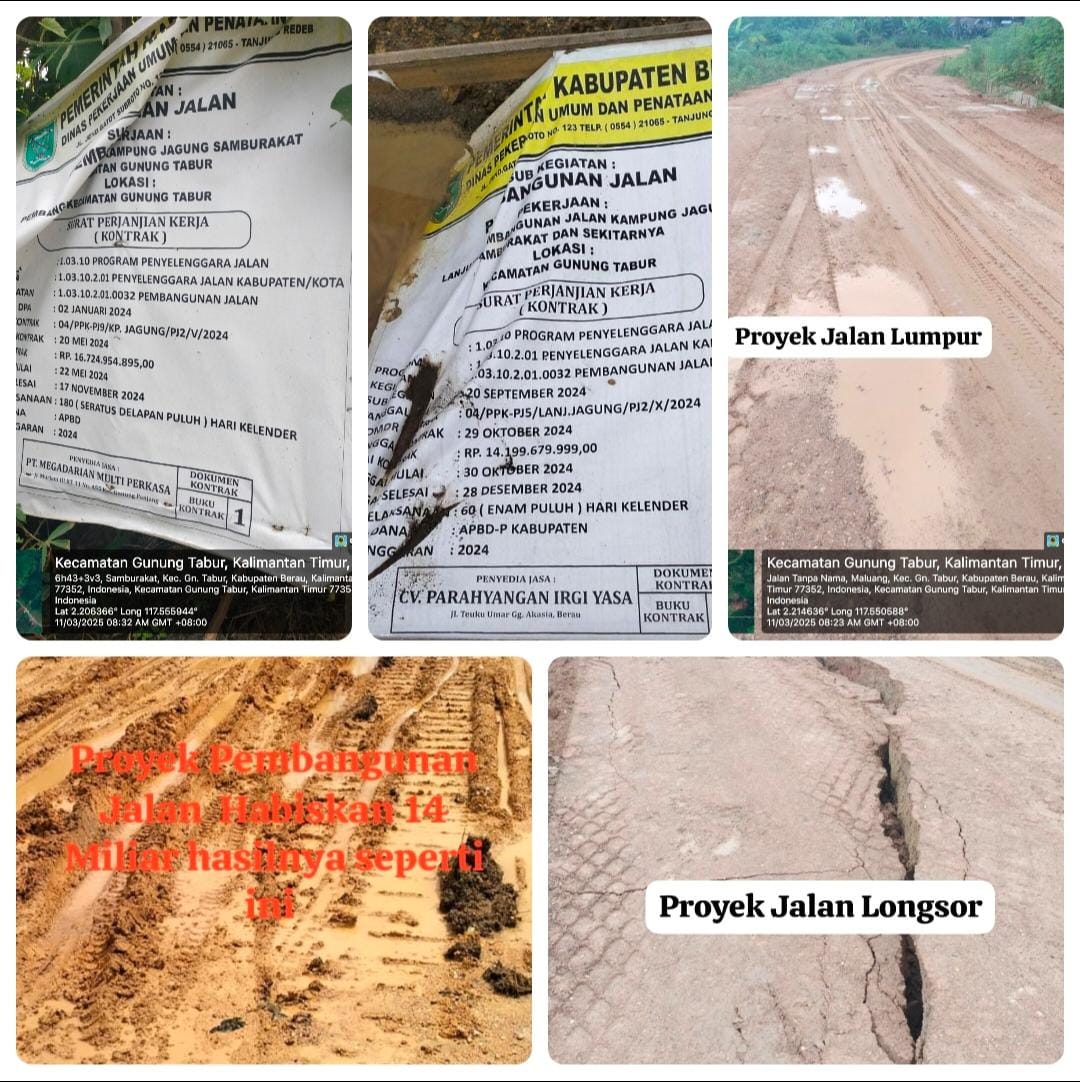 Kaltim, Berau, Derap Kalimantan – Proyek pembangunan jalan sertu di Kampung Jagung, Samburakat, Kecamatan Gunung Tabur, Kabupaten Berau, yang menelan anggaran lebih dari Rp 30 miliar dari APBD-P 2024, menuai sorotan tajam. Dua papan proyek dengan nilai masing-masing Rp 16 miliar dan Rp 14 miliar tampak di lokasi, namun hasilnya justru memicu kekecewaan publik.(17/3).