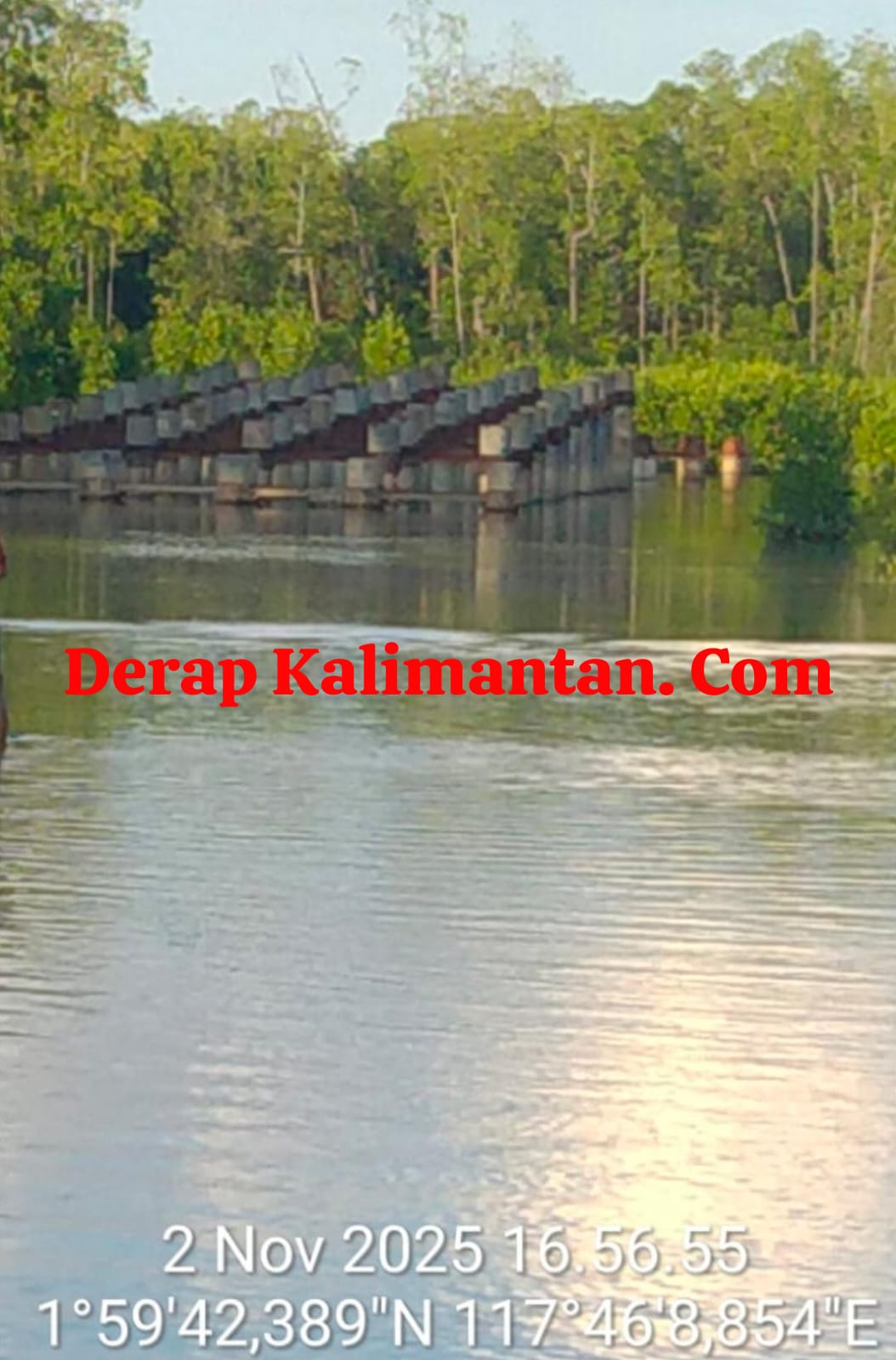 Berau, Kaltim – Proyek pembangunan Jembatan Mantaritip di Kabupaten Berau, Kalimantan Timur, yang digagas pada tahun 2019, kini tampak mangkrak. Bangunan jembatan yang seharusnya menjadi penghubung vital menuju Pelabuhan Mantaritip kini mengalami kemiringan signifikan dan longsor di sekitar pondasinya, bahkan kondisi jalan yang pasang surut air menjadikan kondisi proyek terbengkelai.