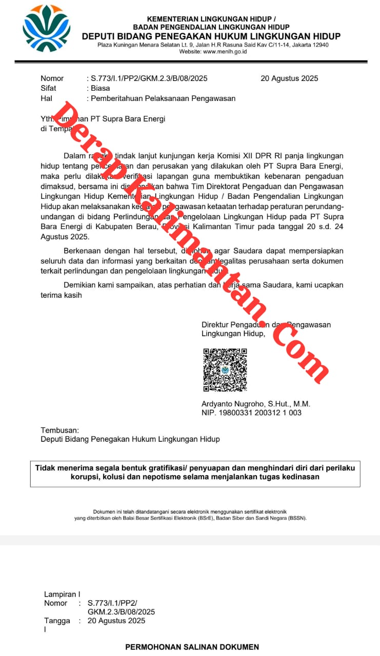Informasi mengenai kegiatan pengawasan tersebut terungkap melalui surat pemberitahuan bernomor : S.773/I.1/PP2/GKM.2.3/B/08/2025, yang ditujukan kepada pimpinan PT SBE.