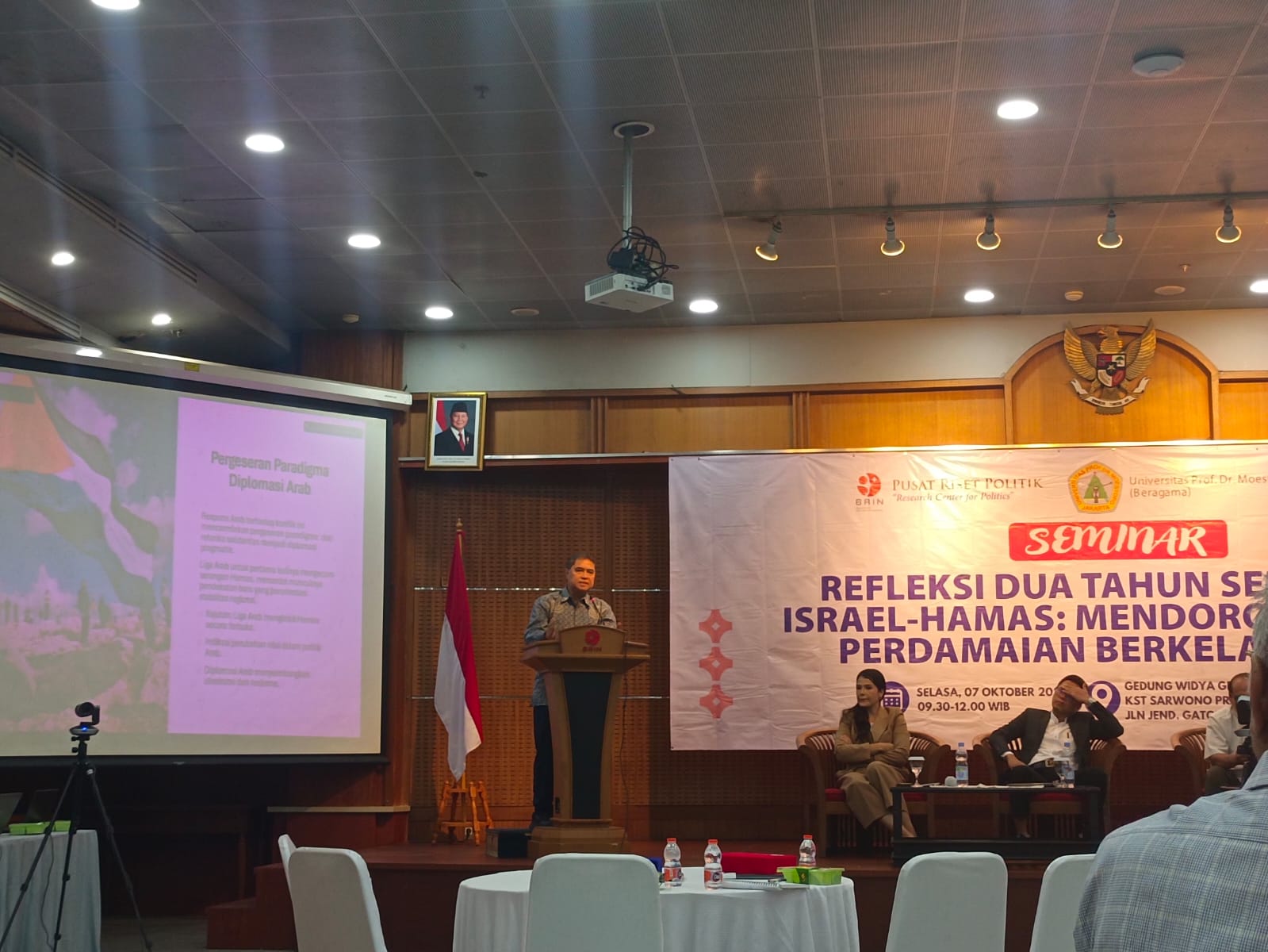 Pembicara lain dalam seminar ini adalah Nostalgiawan Wahyudhi, M.A dari BRIN, dengan makalah berjudul “Respons Indonesia terhadap Two State Solution,” dan Dr. Ryantori dari Universitas Prof. Dr Moestopo (Beragama), dengan topik “Respons Dunia Barat terhadap Penyelesaian Konflik Palestina-Israel.” Seminar yang merupakan kerjasama antara BRIN, Universitas Prof. Dr Moestopo (Beragama), dan The Indonesian Society for Middle East Studies (ISMES) ini dipimpin oleh moderator Sari Amalia Dewi, S.H, LLM dari Universitas Prof. Dr Moestopo (Beragama).