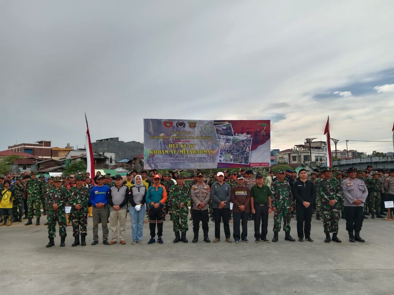 SAMARINDA – Memeriahkan Hari Ulang Tahun (HUT) Ke-67 Kodam VI/Mulawarman, personel Batalyon B Pelopor Satuan Brimob Polda Kalimantan Timur turut serta dalam apel gabungan dan aksi karya bakti bersih-bersih di sejumlah titik di Kota Samarinda, Jumat (11/07/25).