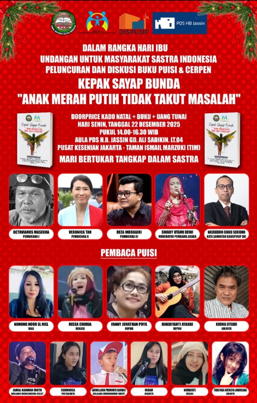 Dalam acara sastra bersama TISI -di ujung akhir tahun 2025 ini- akan tampil pula pembicara Reza Indragiri, dan sambutan Nasruddin Djoko Surjono (Kadispusip DKI) dengan moderator acara Swary Utami Dewi.