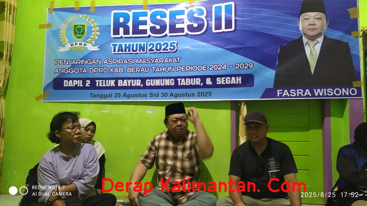 BERAU – Anggota DPRD Kabupaten Berau dari Fraksi Partai Demokrat, Fasra Wisono, melaksanakan kegiatan reses masa sidang tahun 2025 di Daerah Pemilihan (Dapil) II yang meliputi Kecamatan Teluk Bayur, Gunung Tabur, dan Segah. Agenda serap aspirasi ini berlangsung pada Senin (25/8/2025) di Jalan Raja Alam, Gang Bersama RT 02, Kelurahan Rinding, Kecamatan Teluk Bayur.